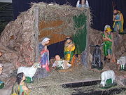 Habituellement, la fête de Noël est la solennité de la nativité de Jésus-Christ, la fête commémorative chrétienne de l'apparition de Jésus de Nazareth qui, selon les Évangiles selon Luc[8] et selon Matthieu[9] serait né à Bethléem. Les historiens hésitent pour leur part entre Bethléem et Nazareth sans qu'une des hypothèse parvienne à s'imposer[10].